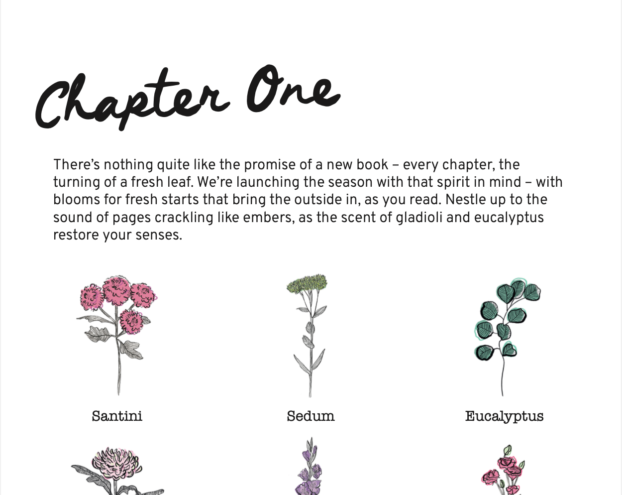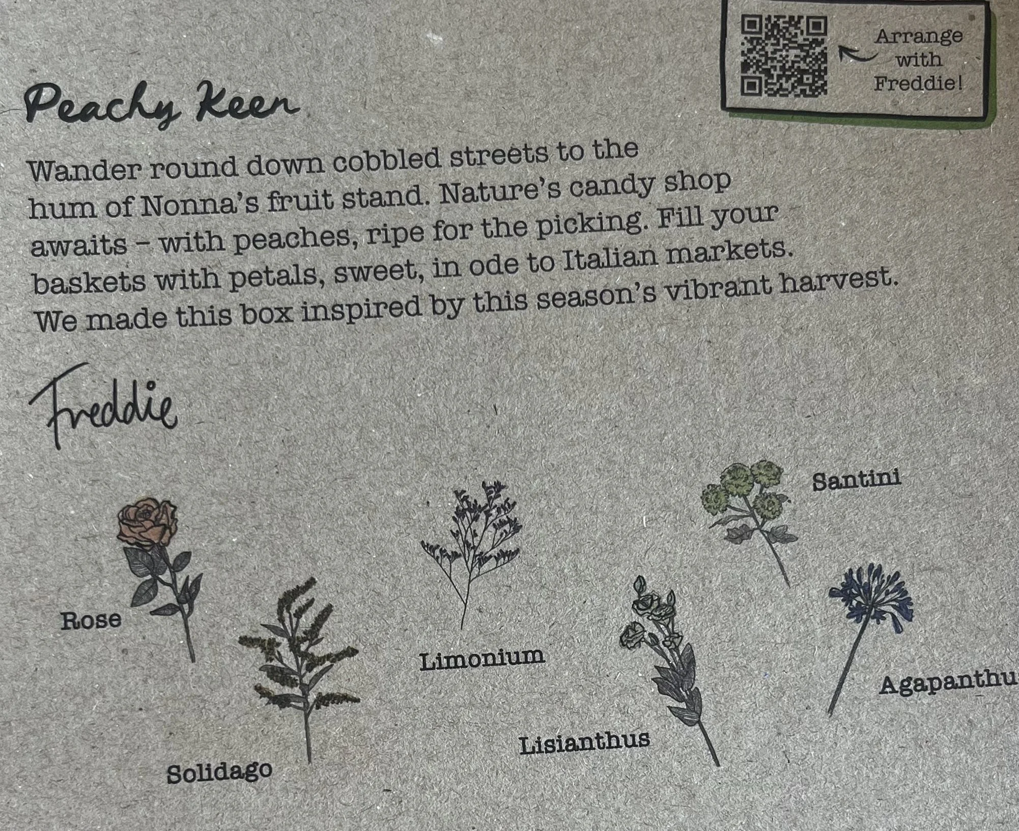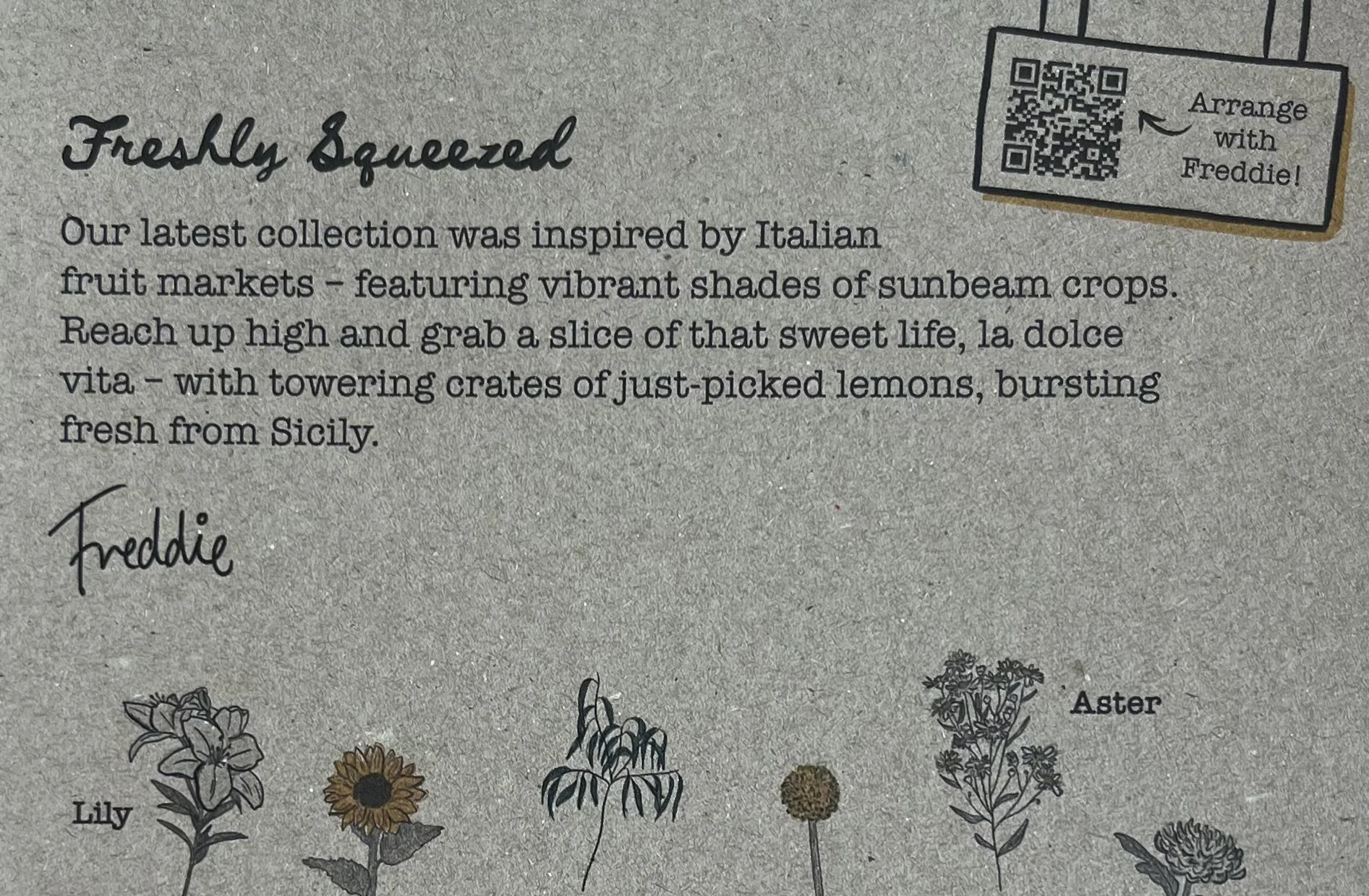 Each month, Freddie’s drop a new collection (of 4-6 bunches) with a different creative concept. Each concept is reflected in the collection’s product names, product descriptions and printed artworks, inspired by the pre-planned stems featuring in each bunch