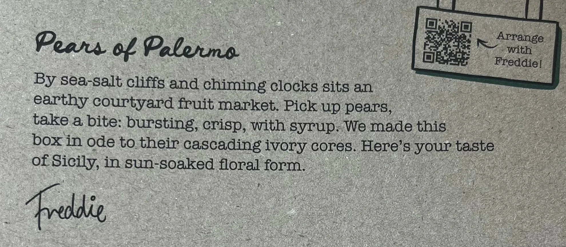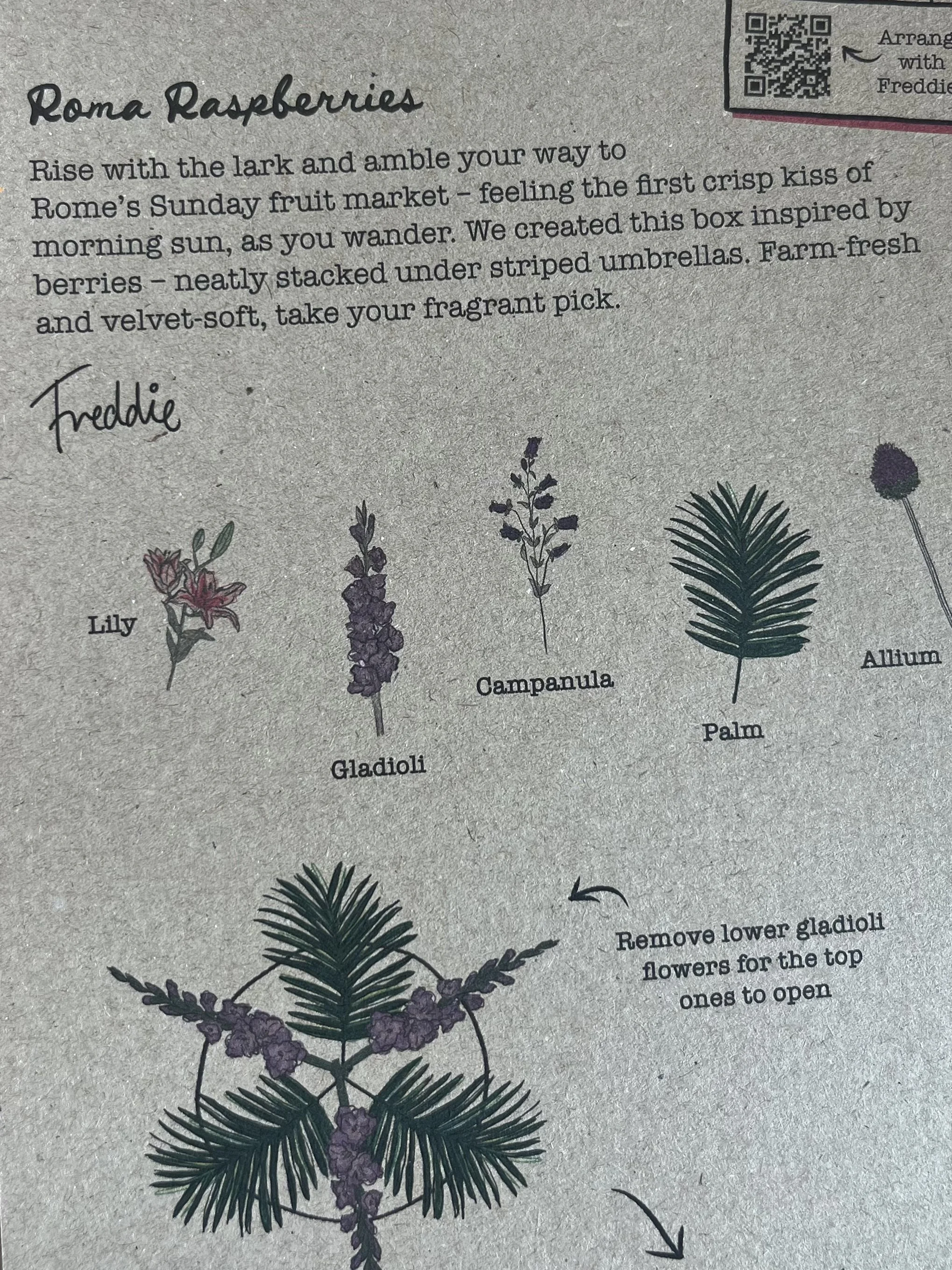 Each month, Freddie’s drop a new collection (of 4-6 bunches) with a different creative concept. Each concept is reflected in the collection’s product names, product descriptions and printed artworks, inspired by the featured pre-planned stems